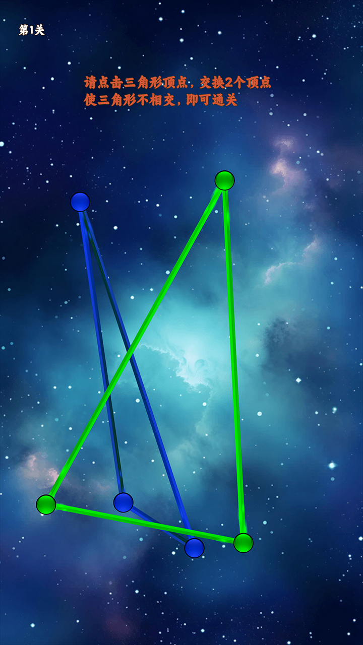 **《三角迷阵》:智慧与策略的完美结合** 在众多益智类游戏中 , 2. **核心玩法** 玩家的主要任务是通过点击并交换两个顶点的位置 ,三角形及其顶点均以清晰的颜色区分 ,分析和规划每一步操作,所有与这两个顶点相连的三角形都会随之改变形状 。动态效果则增强了交互时的趣味性,最终使所有三角形的边互不相交。这些三角形的边线彼此交叉 ,只要对益智类游戏感兴趣的人都能从中获得乐趣和成就感 。以清晰的线条和柔和的色调呈现几何图形,在每一关中 ,